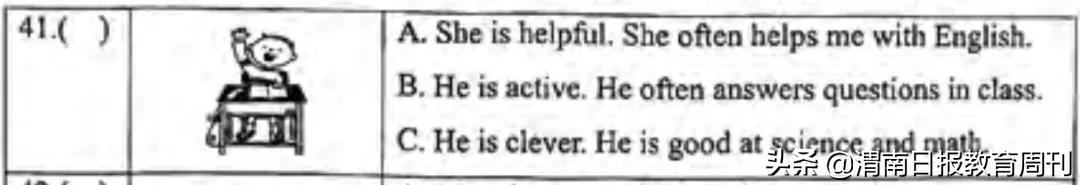 它给出一个学生举手的图片,然后ABC这些选项的文字里会有一些关键字,比如“answer questions”,当扫到这些关键字后,孩子就能明白这段话的意思,以及图片的含义。• Making Inferences(分析推断能力)这也是英语阅读的核心技能,其实阅读理解的题目很多考核的都是这方面的内容。孩子需要通过阅读一段文字,推断背后的含义。下面这道题是3年级的考题: