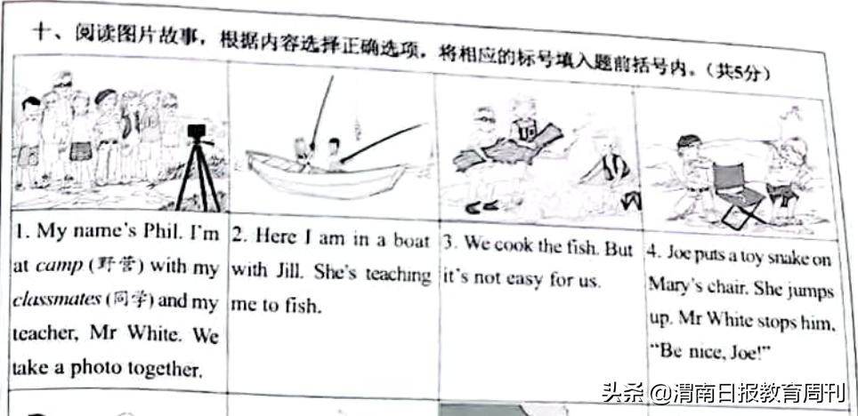 它给我的第一感觉是,图形化比例很高,这一点跟欧美的教学内容越来越像。仔细研究以后发现,英语试卷里藏着未来英语教学的6大方向。• Visualizing(图片记忆和理解能力)这是英语教学里一个重要的技能,它体现在两方面,一个是图片理解,另一个是图片记忆,也就是说读到的文字能够在大脑中形成一张图片,帮助孩子理解和记忆文字的内容。下面这道题是5年级的英语考题: