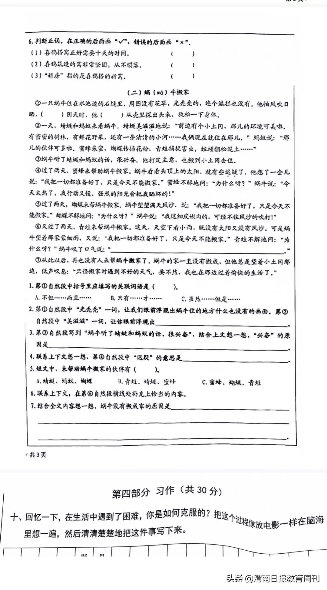 这是西城区三年级的语文期末考试卷节选,两篇阅读理解+一大一小两篇作文。大家可以领会一下精神。