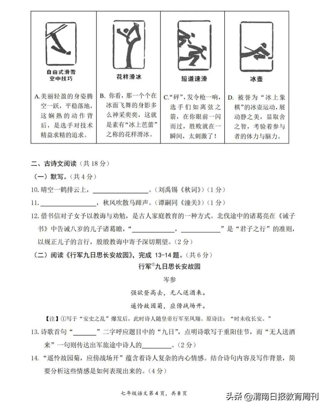 像这种题目,是不可能指望靠题库来应付的。这次期末考试,还有一类题目让家长们叫苦不迭,那就是时事题。时事新闻当然离不开语文,现在最不鼓励的就是“两耳不闻窗外事,一心只读圣贤书”。北京中考每年都有时事内容,这类题目向下传导到中小学期末考,是早晚的事。今年最大的时事是什么?自然是冬奥会。西城和海淀不约而同都考了冬奥会的纪念徽章。这是西城考的部分题目: